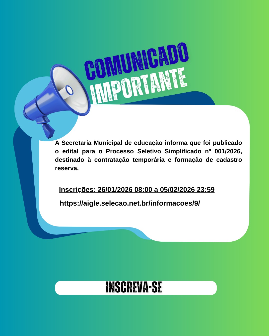 A Secretaria Municipal de Educação informa que foi publicado o edital para o Processo Seletivo Simplificado nº001/2026, destinado a contratação temporária e formação de cadastro reserva.